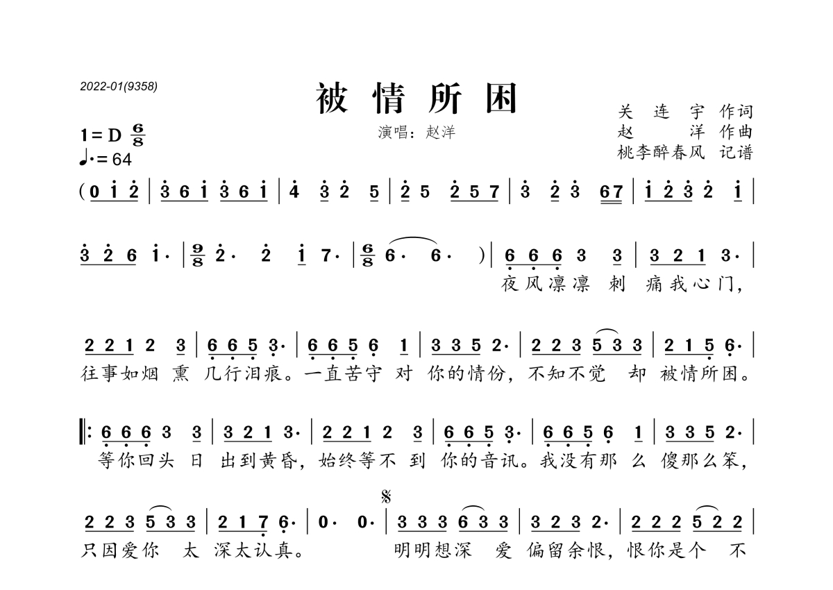 《被情所困》是赵洋演唱的一首歌曲,拍号为6/8拍,歌曲速度为每分钟64拍,这份简谱共有一张高清图谱,图谱由 @桃李醉春风 编配上传。