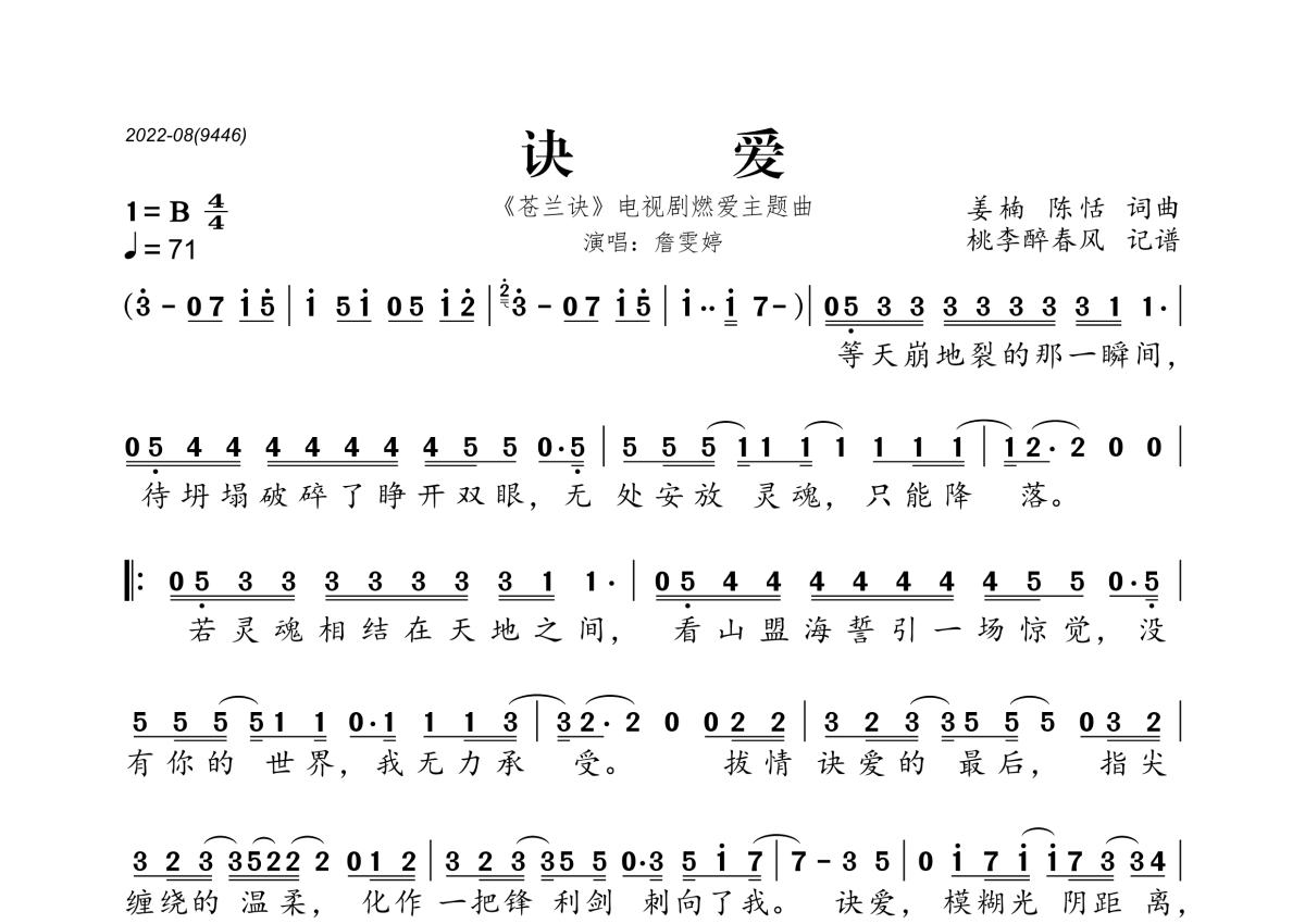 《诀爱》是詹雯婷演唱的一首歌曲,拍号为4/4拍,歌曲速度为每分钟71拍,这份简谱共有一张高清图谱,图谱由 @桃李醉春风 编配上传。