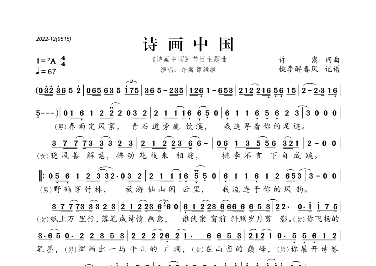 《诗画中国》是许嵩&谭维维演唱的一首歌曲,拍号为4/4拍,歌曲速度为每分钟67拍,这份简谱共有一张高清图谱,图谱由 @桃李醉春风 编配上传。