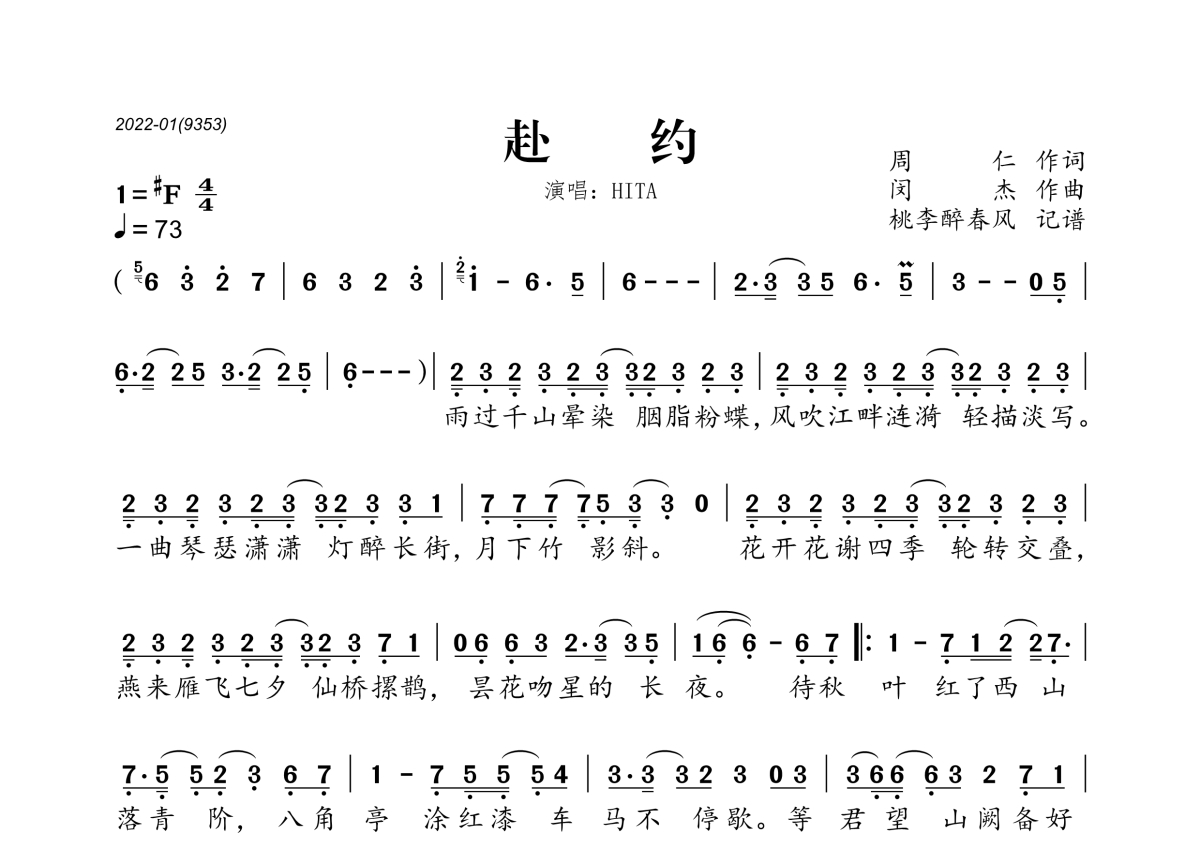 《赴约》是HITA演唱的一首歌曲,拍号为4/4拍,歌曲速度为每分钟73拍,这份简谱共有一张高清图谱,图谱由 @桃李醉春风 编配上传。