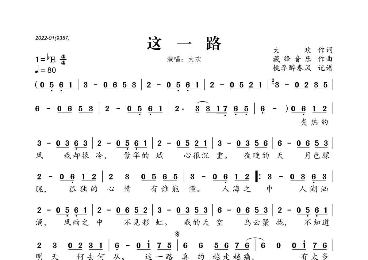 这一路简谱 - 大欢演唱