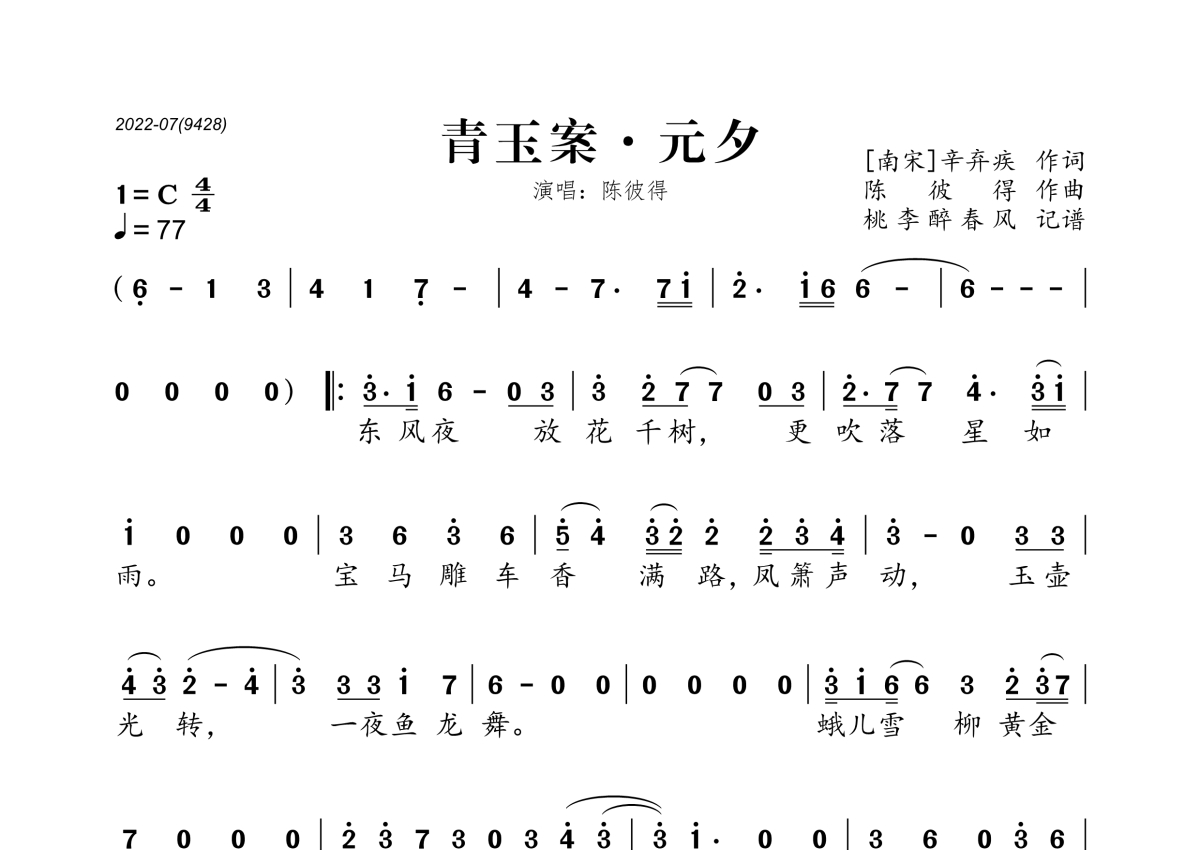 《青玉案·元夕》是陈彼得演唱的一首歌曲,拍号为4/4拍,歌曲速度为每分钟77拍,这份简谱共有一张高清图谱,图谱由 @桃李醉春风 编配上传。