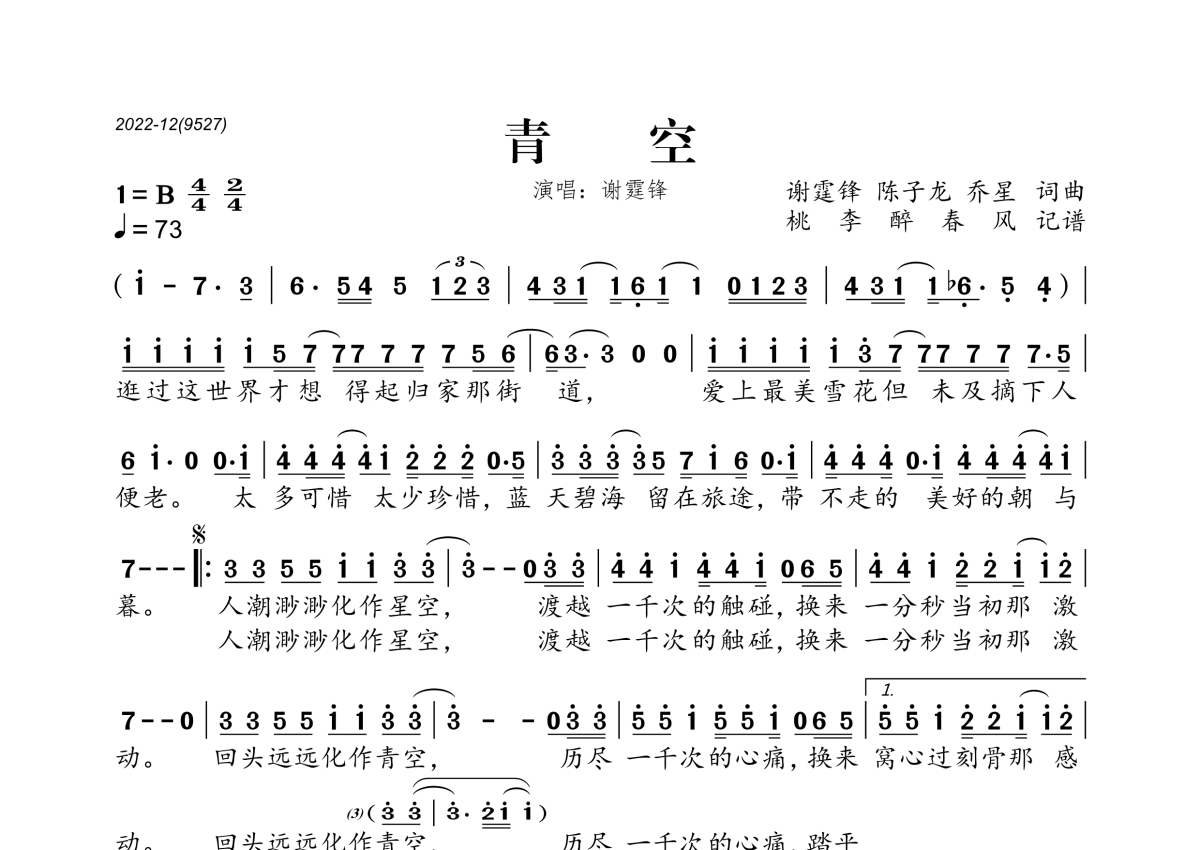 《青空》是谢霆锋演唱的一首歌曲,拍号为4/4拍,歌曲速度为每分钟73拍,这份简谱共有一张高清图谱,图谱由 @桃李醉春风 编配上传。