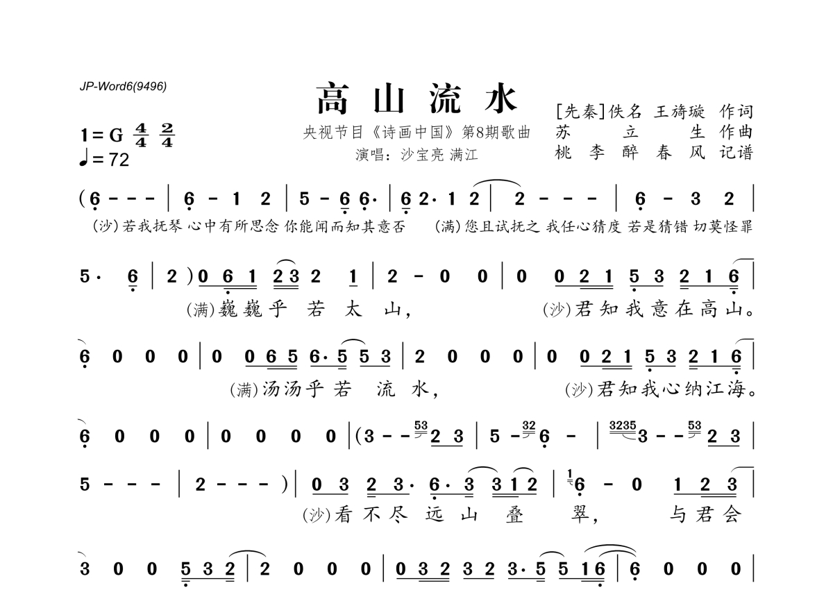 《高山流水》是沙宝亮&满江演唱的一首歌曲,拍号为4/4拍,歌曲速度为每分钟72拍,这份简谱共有两张高清图谱,图谱由 @桃李醉春风 编配上传。