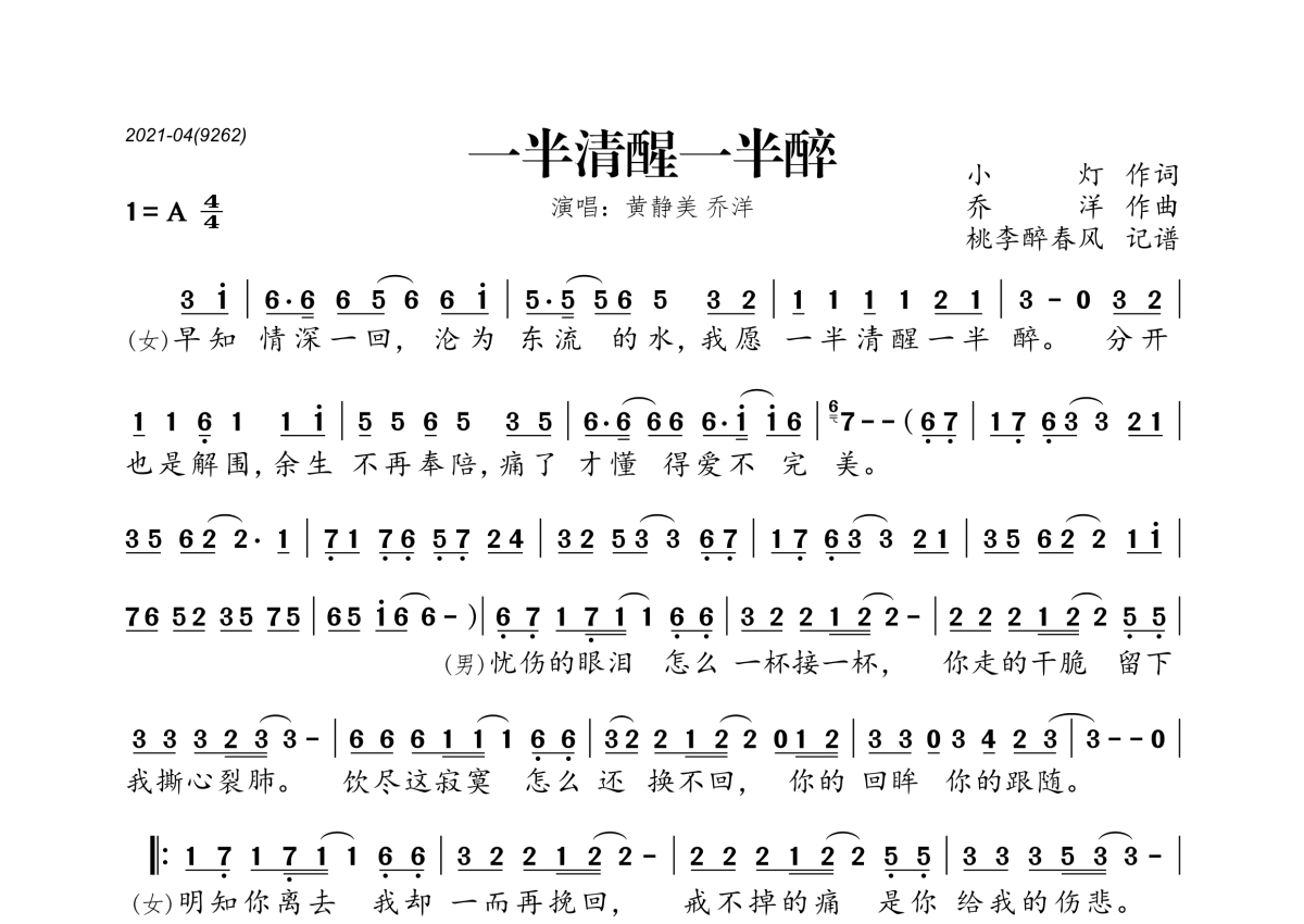 《一半清醒一半醉》是黄静美&乔洋演唱的一首歌曲,拍号为4/4拍,这份简谱共有一张高清图谱,图谱由 @桃李醉春风 编配上传。