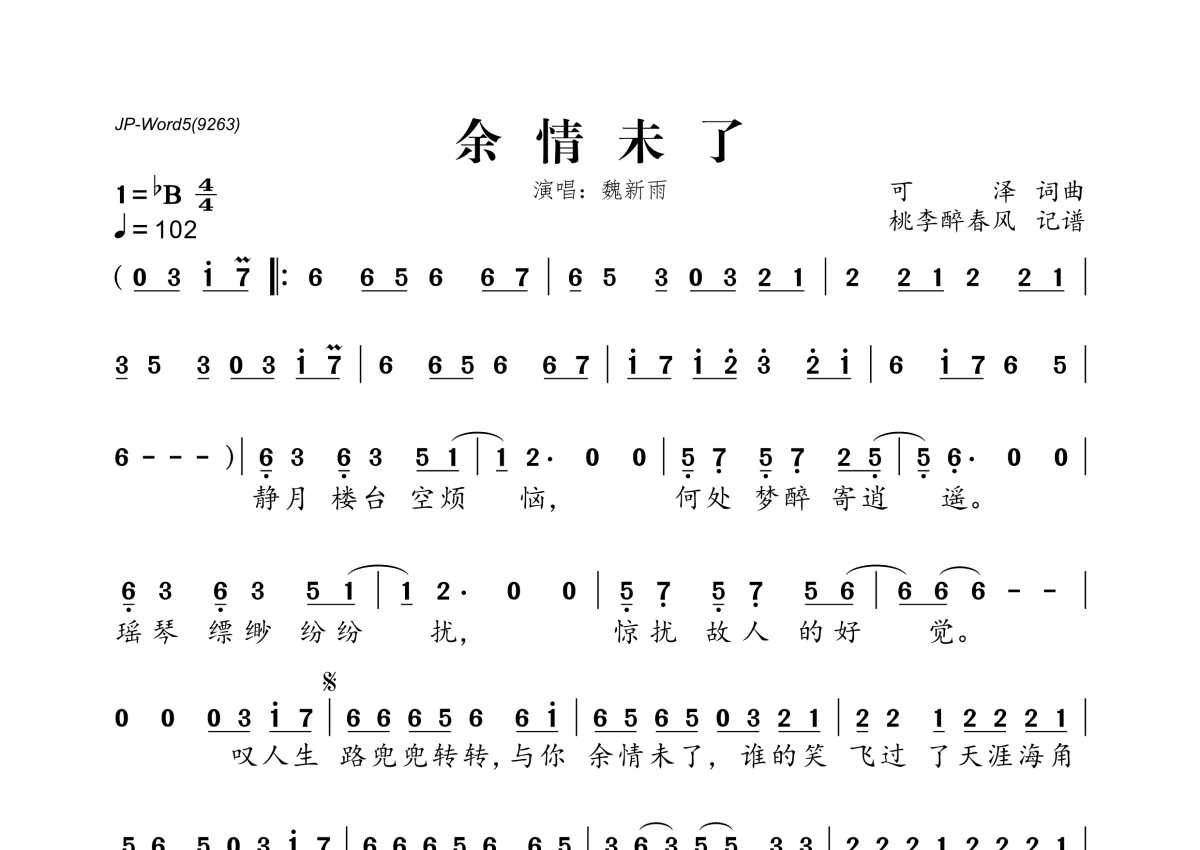 《余情未了》是魏新雨演唱的一首歌曲,拍号为4/4拍,歌曲速度为每分钟102拍,这份简谱共有一张高清图谱,图谱由 @桃李醉春风 编配上传。