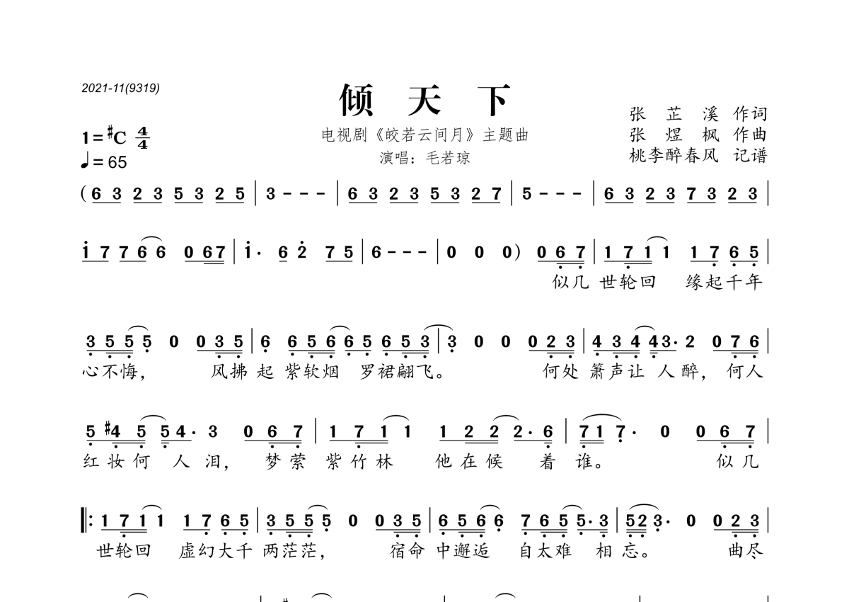 《倾天下》是毛若琼演唱的一首歌曲,拍号为4/4拍,歌曲速度为每分钟65拍,这份简谱共有一张高清图谱,图谱由 @桃李醉春风 编配上传。