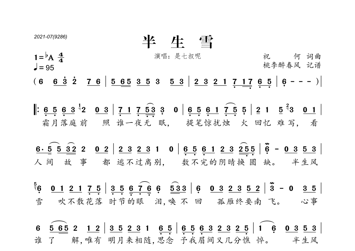 《半生雪》是是七叔呢演唱的一首歌曲,拍号为4/4拍,歌曲速度为每分钟95拍,这份简谱共有一张高清图谱,图谱由 @桃李醉春风 编配上传。