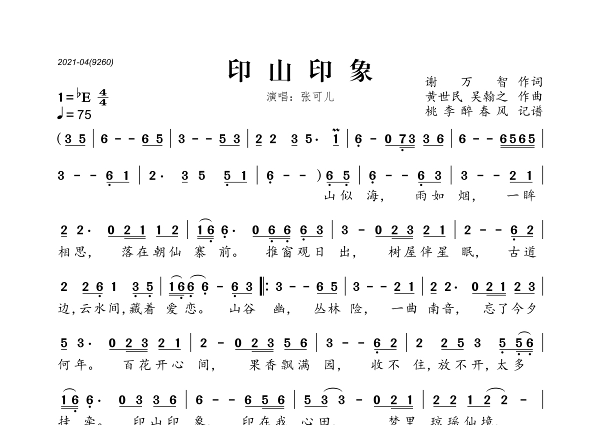 《印山印象》是张可儿演唱的一首歌曲,拍号为4/4拍,歌曲速度为每分钟75拍,这份简谱共有一张高清图谱,图谱由 @桃李醉春风 编配上传。
