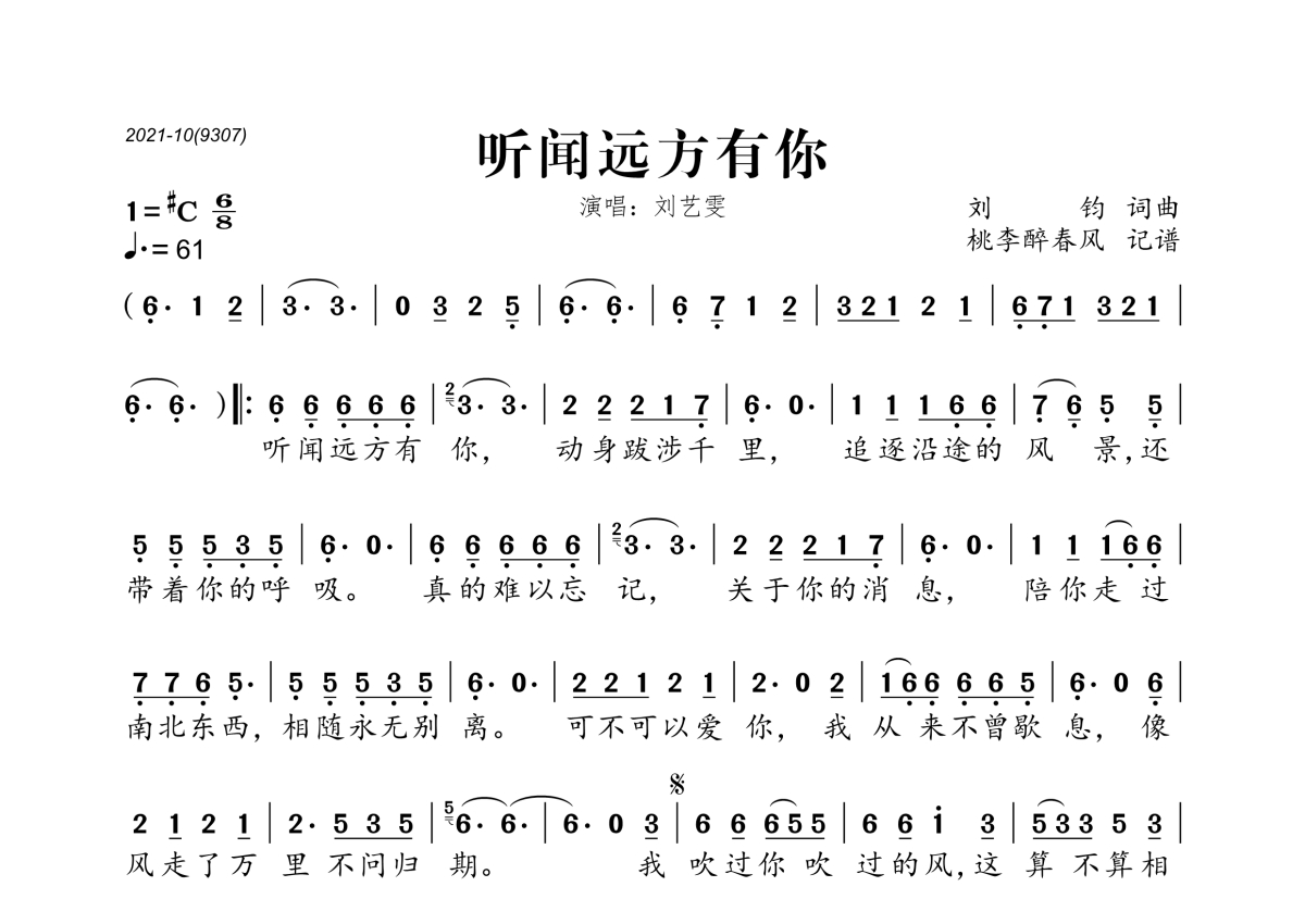《听闻远方有你》是刘艺雯演唱的一首歌曲,拍号为6/8拍,歌曲速度为每分钟61拍,这份简谱共有一张高清图谱,图谱由 @桃李醉春风 编配上传。