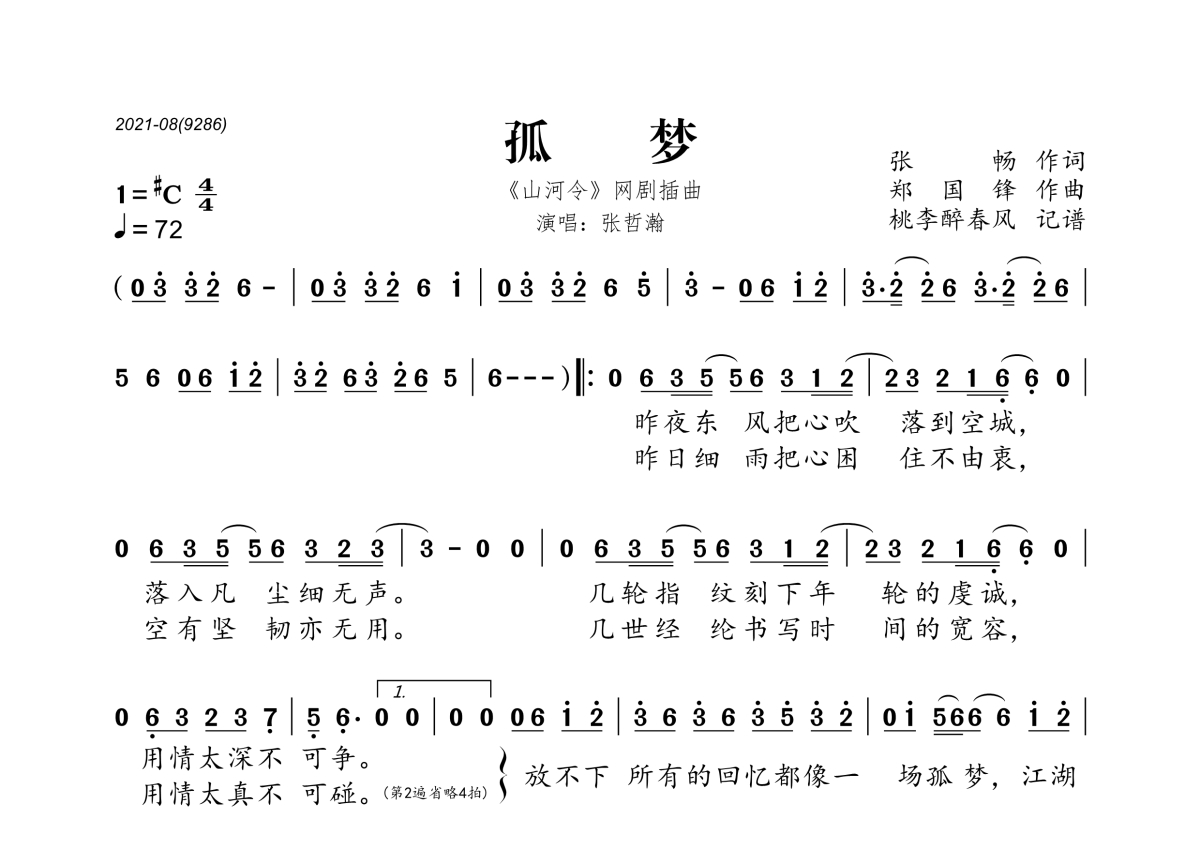 《孤梦》是张哲瀚演唱的一首歌曲,拍号为4/4拍,歌曲速度为每分钟72拍,这份简谱共有一张高清图谱,图谱由 @桃李醉春风 编配上传。