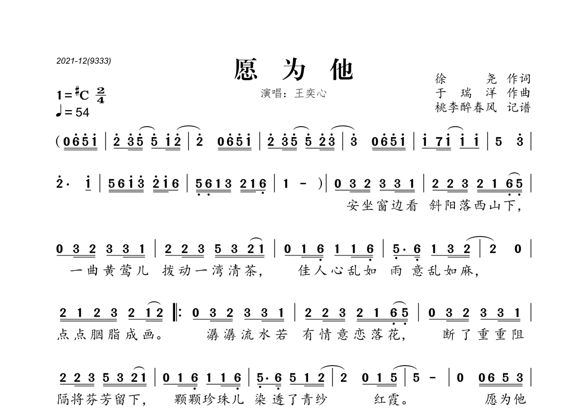 《愿为他》是王奕心演唱的一首歌曲,拍号为2/4拍,歌曲速度为每分钟54拍,这份简谱共有一张高清图谱,图谱由 @桃李醉春风 编配上传。