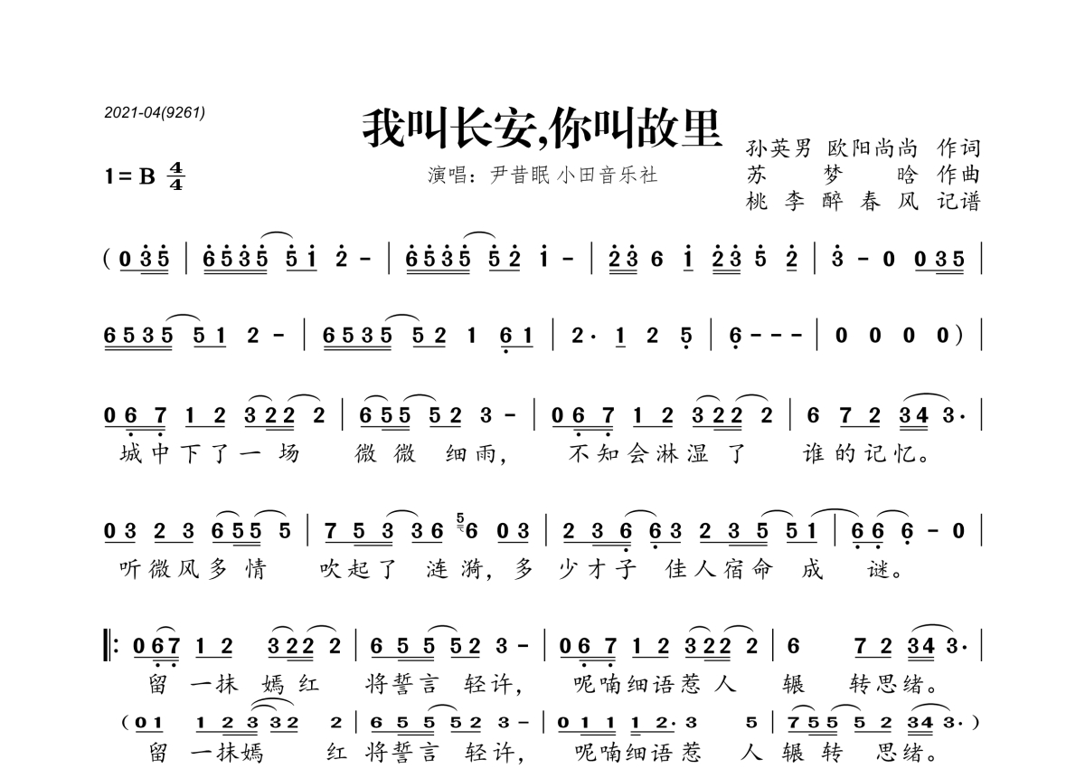 尹昔眠&小田音乐社《我叫长安,你叫故里》简谱