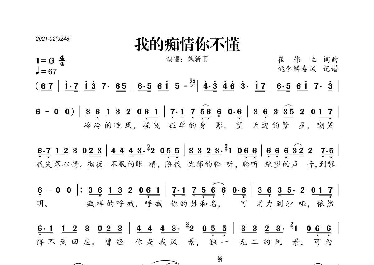 《我的痴情你不懂》是魏新雨演唱的一首歌曲,拍号为4/4拍,歌曲速度为每分钟67拍,这份简谱共有一张高清图谱,图谱由 @桃李醉春风 编配上传。