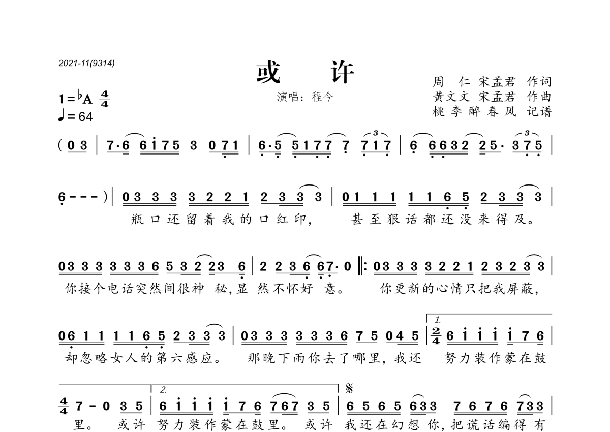 《或许》是程今演唱的一首歌曲,拍号为4/4拍,歌曲速度为每分钟64拍,这份简谱共有一张高清图谱,图谱由 @桃李醉春风 编配上传。