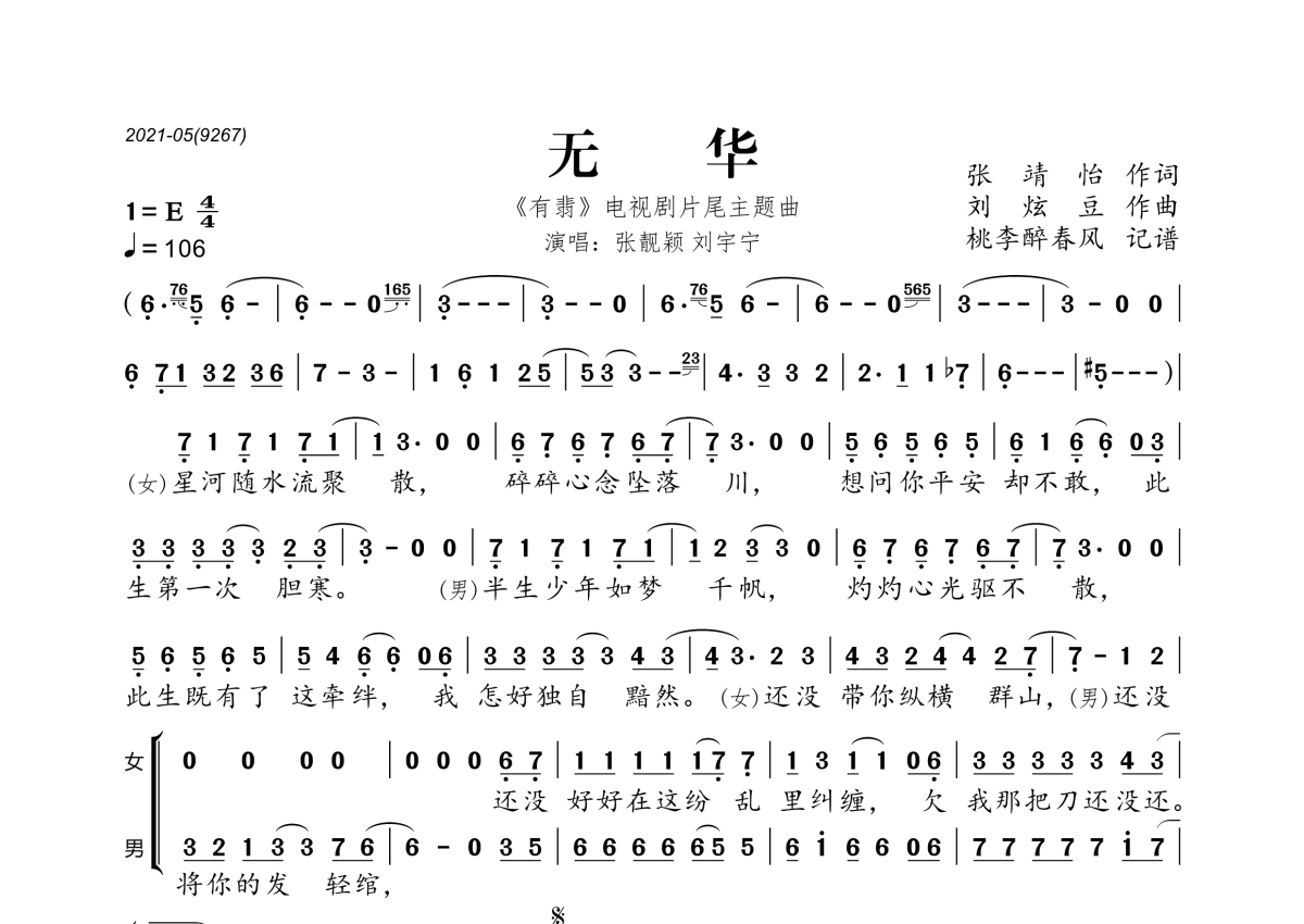 《无华》是张靓颖&摩登兄弟刘宇宁演唱的一首歌曲,拍号为4/4拍,歌曲速度为每分钟106拍,这份简谱共有一张高清图谱,图谱由 @桃李醉春风 编配上传。