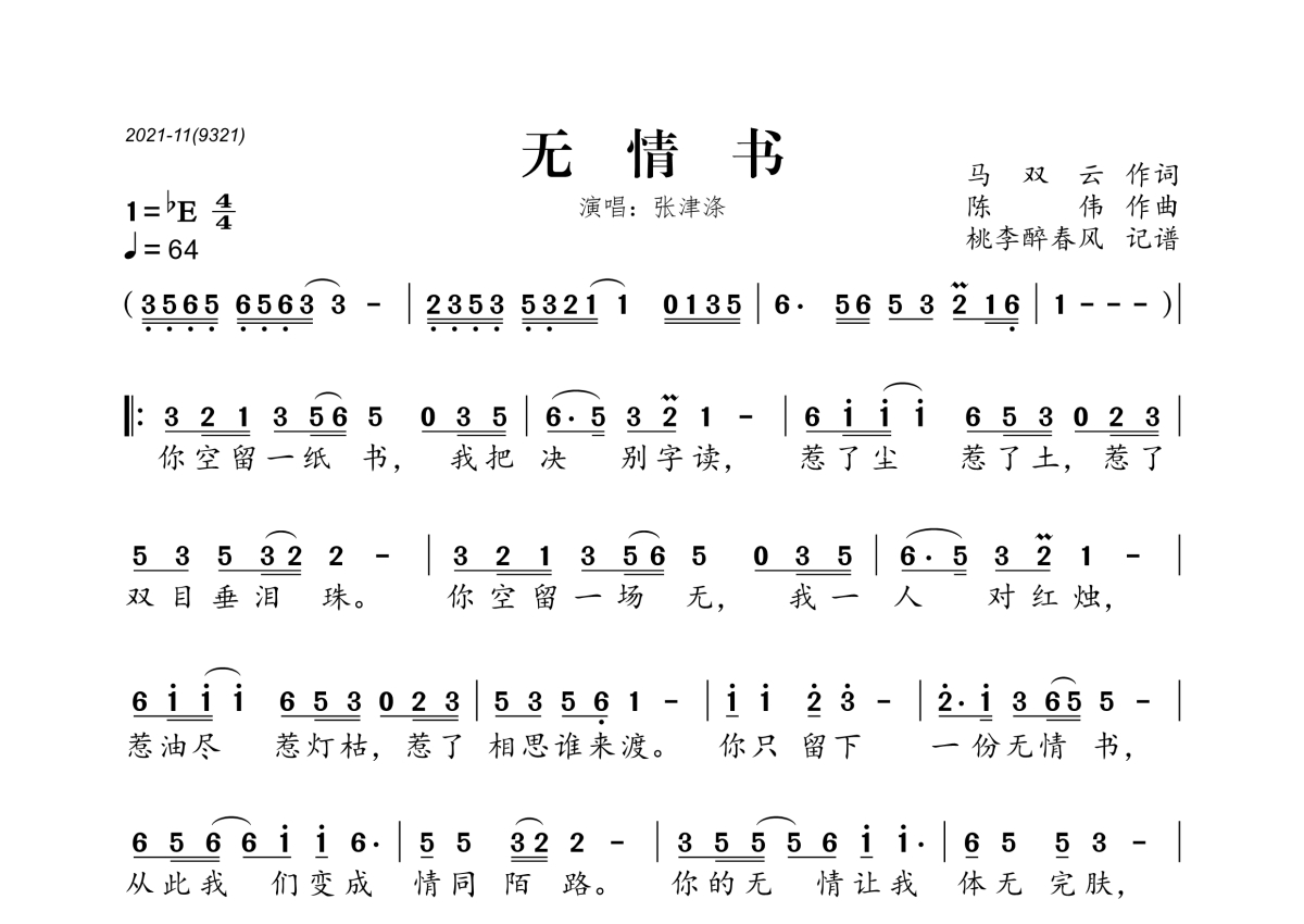 《无情书》是张津涤演唱的一首歌曲,拍号为4/4拍,歌曲速度为每分钟64拍,这份简谱共有一张高清图谱,图谱由 @桃李醉春风 编配上传。