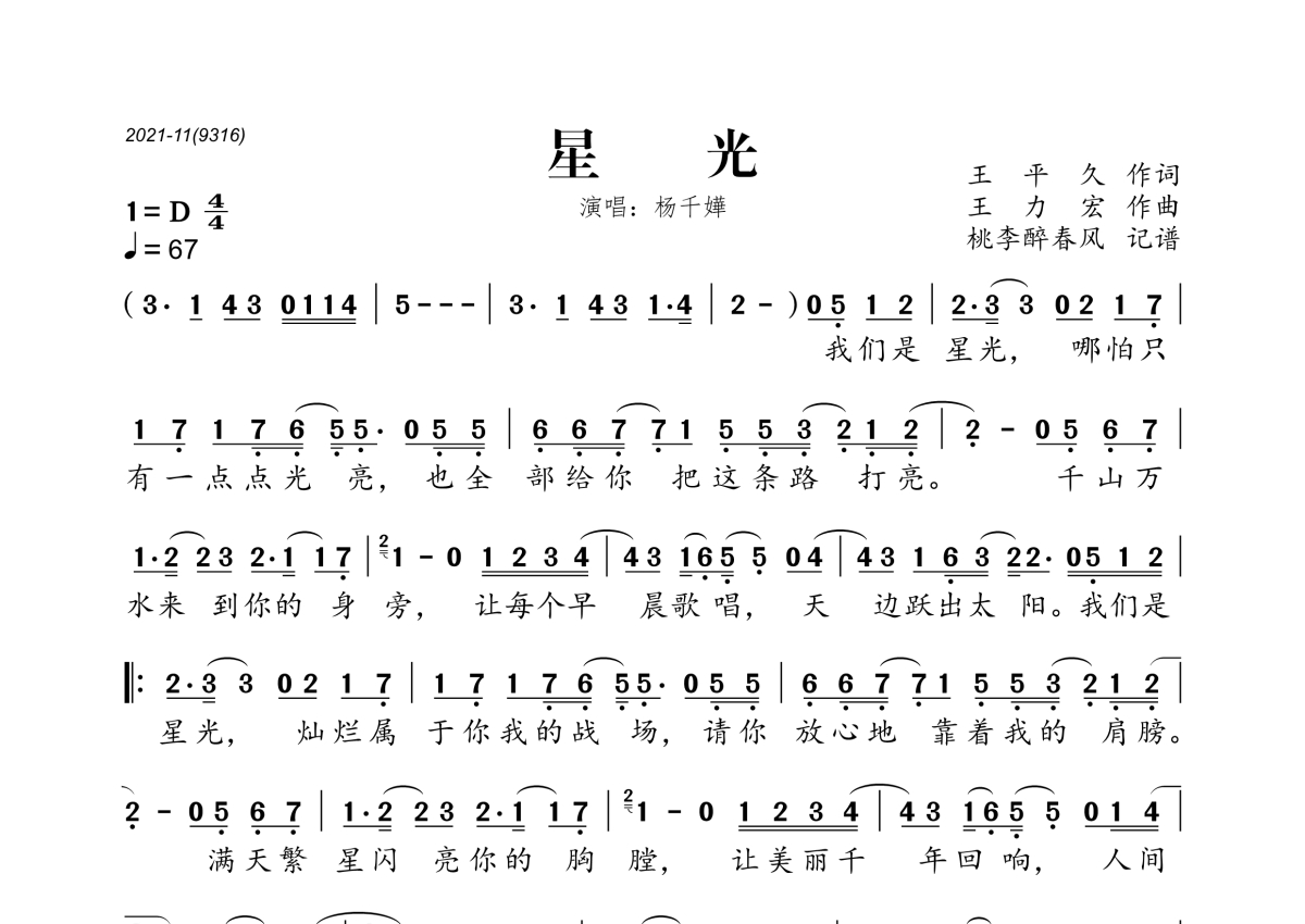 《星光》是杨千嬅演唱的一首歌曲,拍号为4/4拍,歌曲速度为每分钟67拍,这份简谱共有一张高清图谱,图谱由 @桃李醉春风 编配上传。