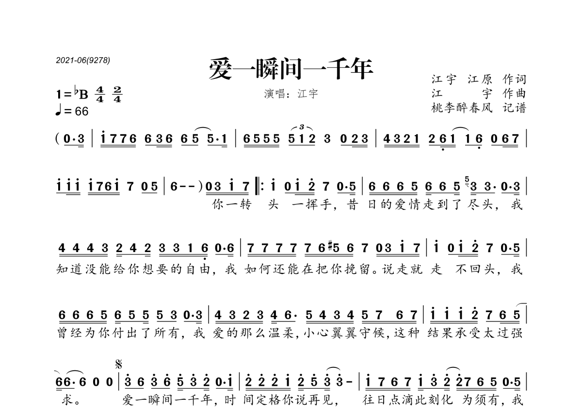 《爱一瞬间一千年》是江宇演唱的一首歌曲,拍号为4/4拍,歌曲速度为每分钟66拍,这份简谱共有一张高清图谱,图谱由 @桃李醉春风 编配上传。
