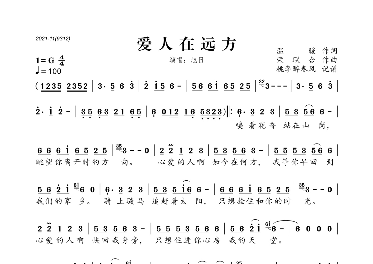 《爱人在远方》是旭日演唱的一首歌曲,拍号为4/4拍,歌曲速度为每分钟100拍,这份简谱共有一张高清图谱,图谱由 @桃李醉春风 编配上传。