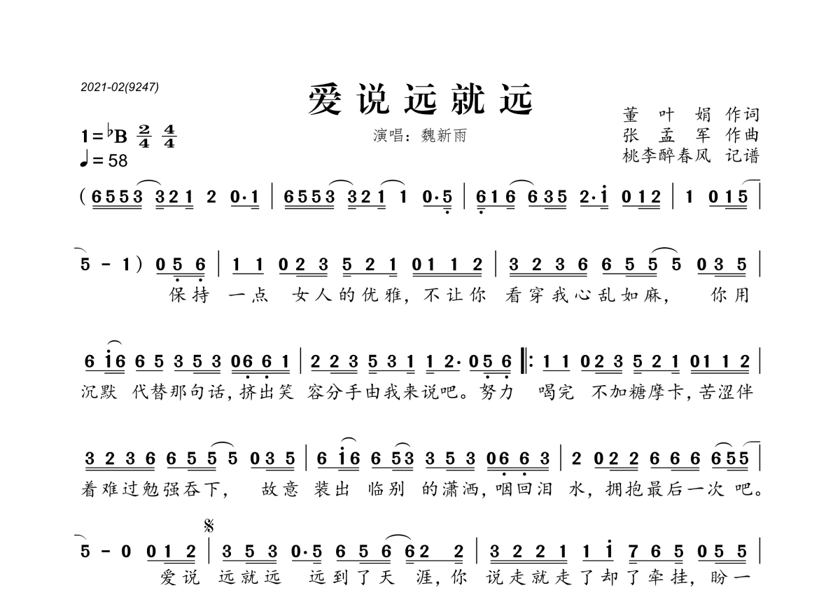 《爱说远就远》是魏新雨演唱的一首歌曲,拍号为4/4拍,歌曲速度为每分钟58拍,这份简谱共有一张高清图谱,图谱由 @桃李醉春风 编配上传。