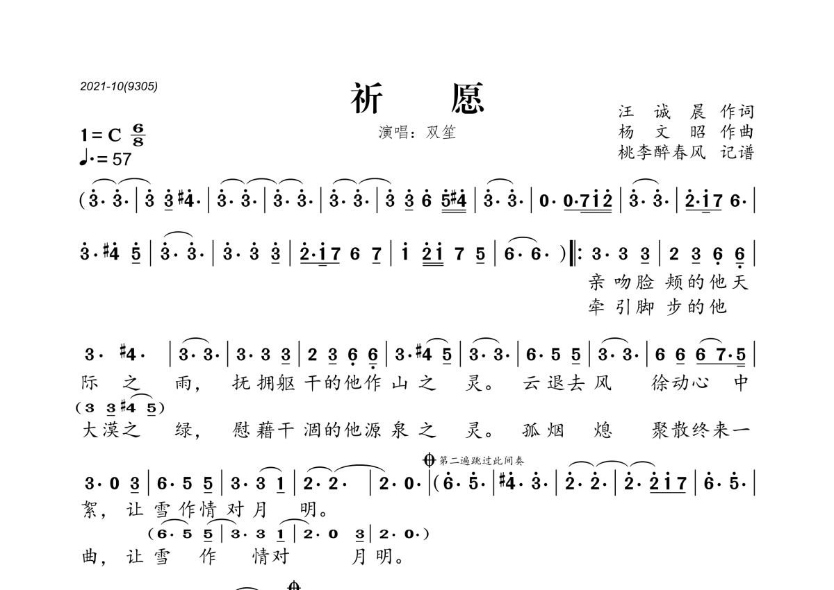 《祈愿》是双笙演唱的一首歌曲,拍号为6/8拍,歌曲速度为每分钟57拍,这份简谱共有一张高清图谱,图谱由 @桃李醉春风 编配上传。