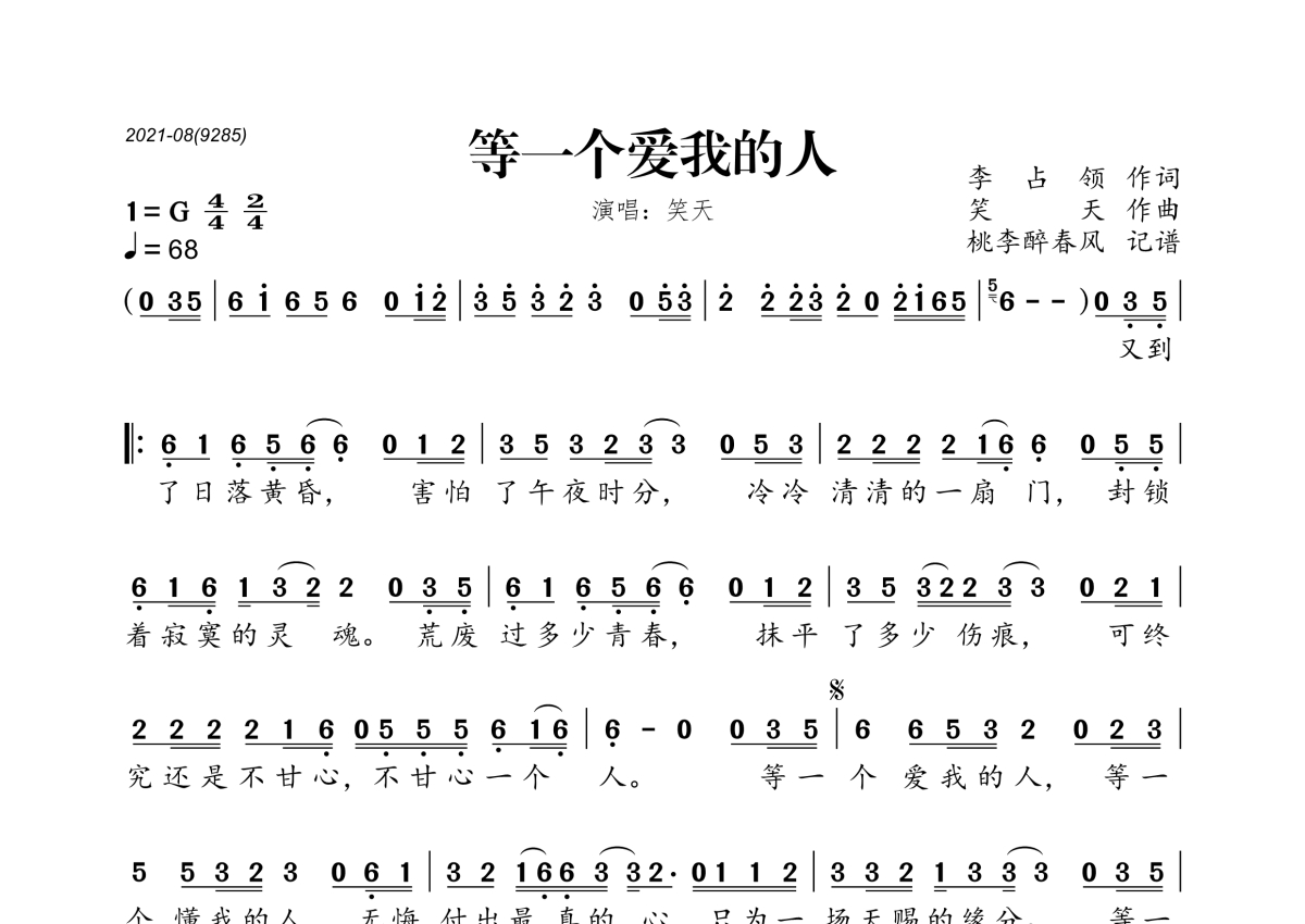 《等一个爱我的人》是笑天演唱的一首歌曲,拍号为4/4拍,歌曲速度为每分钟68拍,这份简谱共有一张高清图谱,图谱由 @桃李醉春风 编配上传。