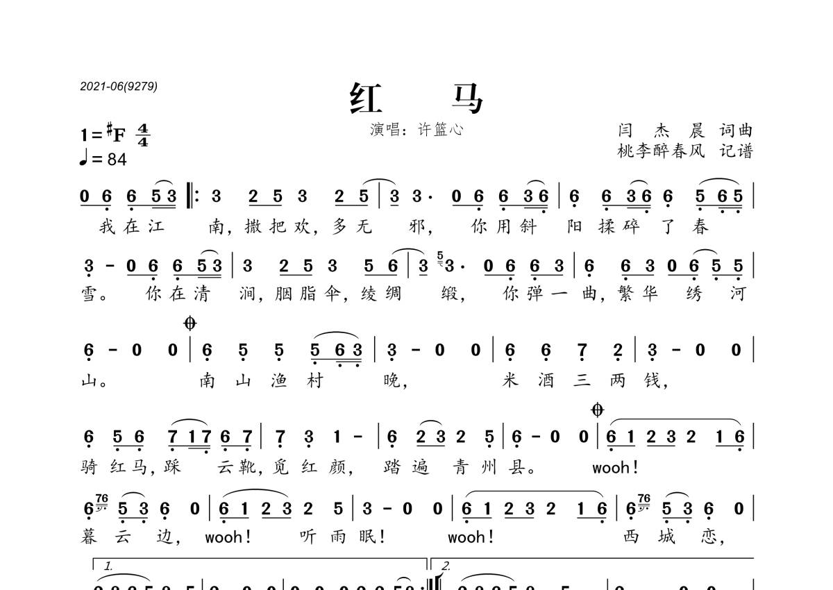 《红马》是许篮心演唱的一首歌曲,拍号为4/4拍,歌曲速度为每分钟84拍,这份简谱共有一张高清图谱,图谱由 @桃李醉春风 编配上传。