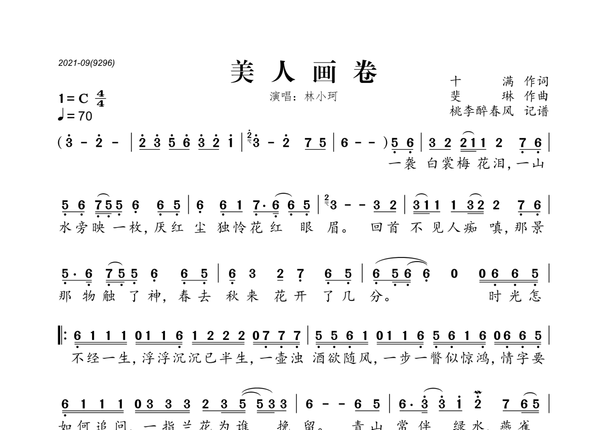 《美人画卷》是林小珂演唱的一首歌曲,拍号为4/4拍,歌曲速度为每分钟70拍,这份简谱共有一张高清图谱,图谱由 @桃李醉春风 编配上传。
