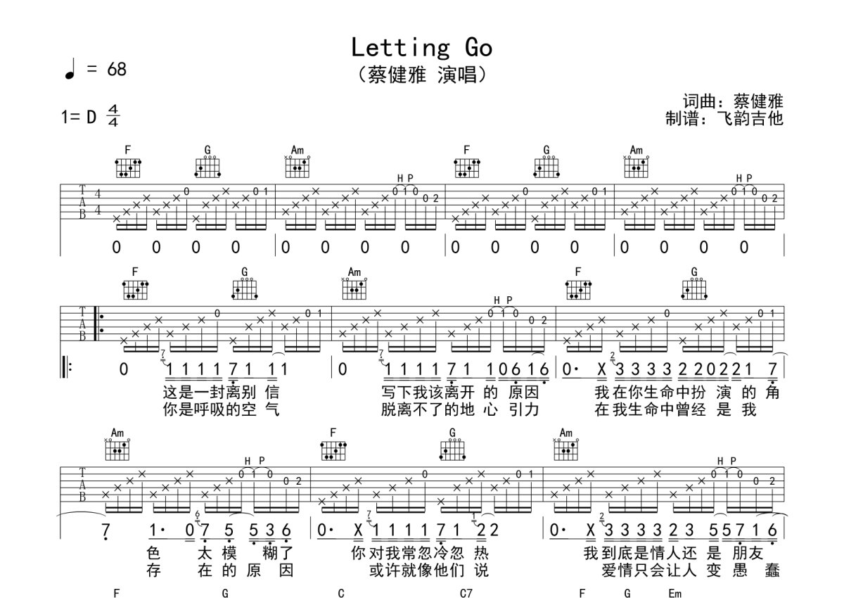 蔡健雅《Letting Go》吉他谱 - G调弹唱六线谱