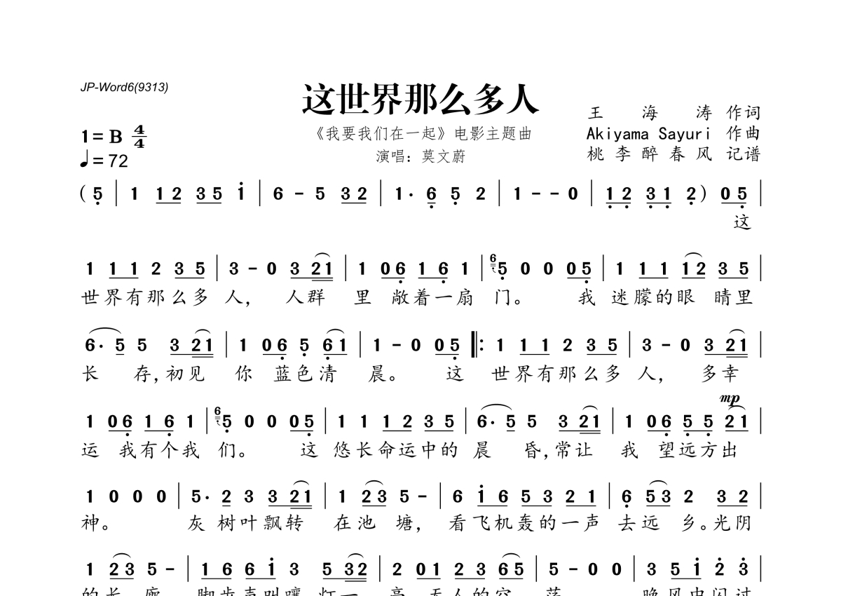 《这世界那么多人》是莫文蔚演唱的一首歌曲,拍号为4/4拍,歌曲速度为每分钟72拍,这份简谱共有一张高清图谱,图谱由 @桃李醉春风 编配上传。