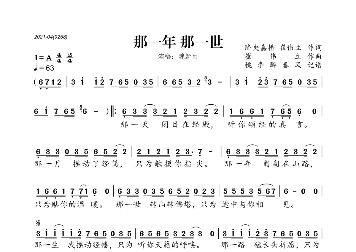 《那一年 那一世》是魏新雨演唱的一首歌曲,拍号为4/4拍,歌曲速度为每分钟63拍,这份简谱共有一张高清图谱,图谱由 @桃李醉春风 编配上传。