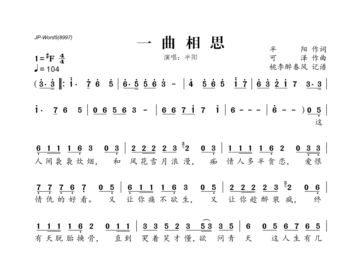 《一曲相思》是半阳演唱的一首歌曲,拍号为4/4拍,歌曲速度为每分钟104拍,这份简谱共有一张高清图谱,图谱由 @桃李醉春风 编配上传。
