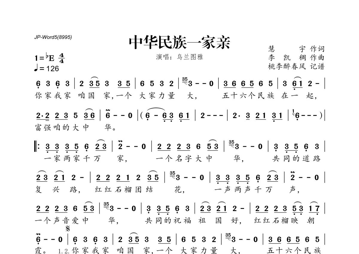 《中华民族一家亲》是鸟兰图雅演唱的一首歌曲,拍号为4/4拍,歌曲速度为每分钟126拍,这份简谱共有一张高清图谱,图谱由 @桃李醉春风 编配上传。