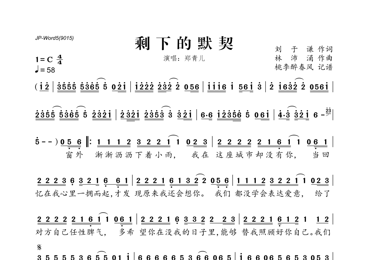 《剩下的默契》是郑青儿演唱的一首歌曲,拍号为4/4拍,歌曲速度为每分钟58拍,这份简谱共有一张高清图谱,图谱由 @桃李醉春风 编配上传。