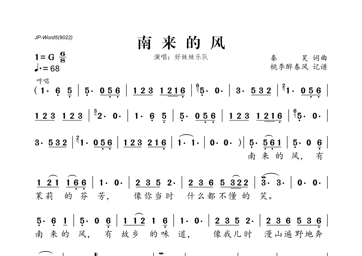 《南来的风》是好妹妹乐队演唱的一首歌曲,拍号为6/8拍,歌曲速度为每分钟68拍,这份简谱共有一张高清图谱,图谱由 @桃李醉春风 编配上传。