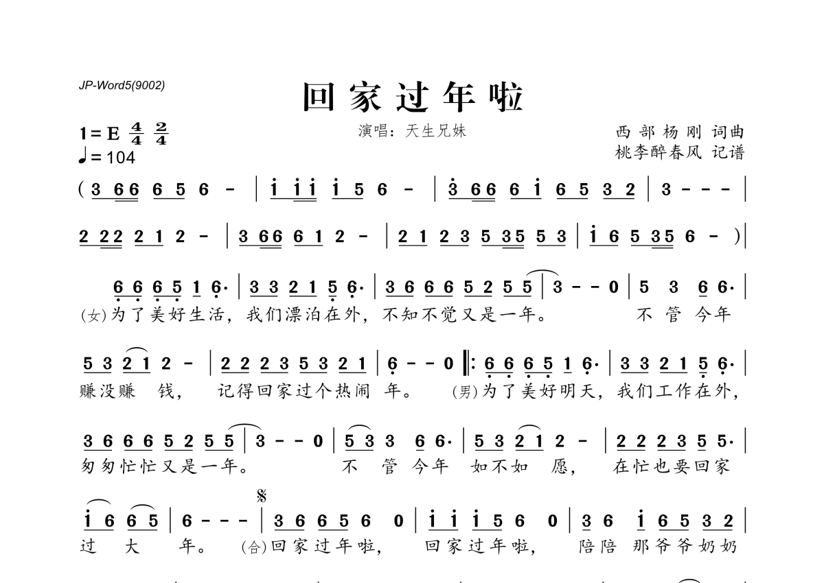 《回家过年啦》是天生兄妹演唱的一首歌曲,拍号为4/4拍,歌曲速度为每分钟104拍,这份简谱共有一张高清图谱,图谱由 @桃李醉春风 编配上传。