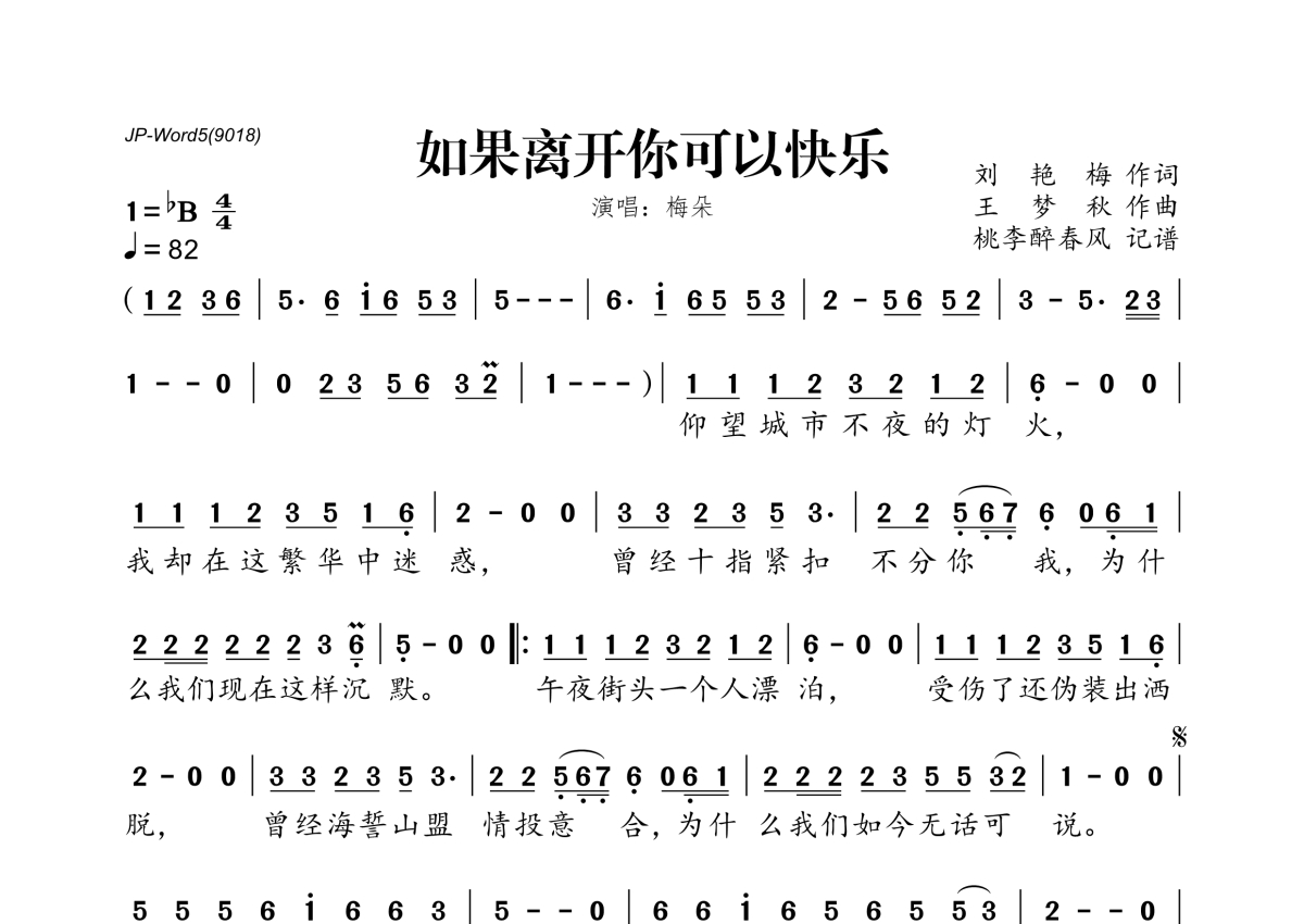《如果离开你可以快乐》是梅朵演唱的一首歌曲,拍号为4/4拍,歌曲速度为每分钟82拍,这份简谱共有一张高清图谱,图谱由 @桃李醉春风 编配上传。