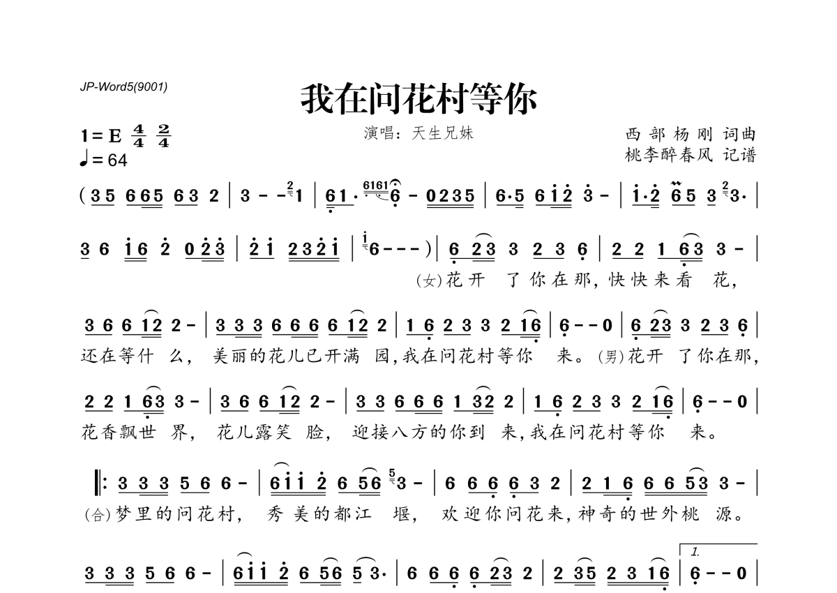 《我在问花村等你》是天生兄妹演唱的一首歌曲,拍号为4/4拍,歌曲速度为每分钟64拍,这份简谱共有一张高清图谱,图谱由 @桃李醉春风 编配上传。