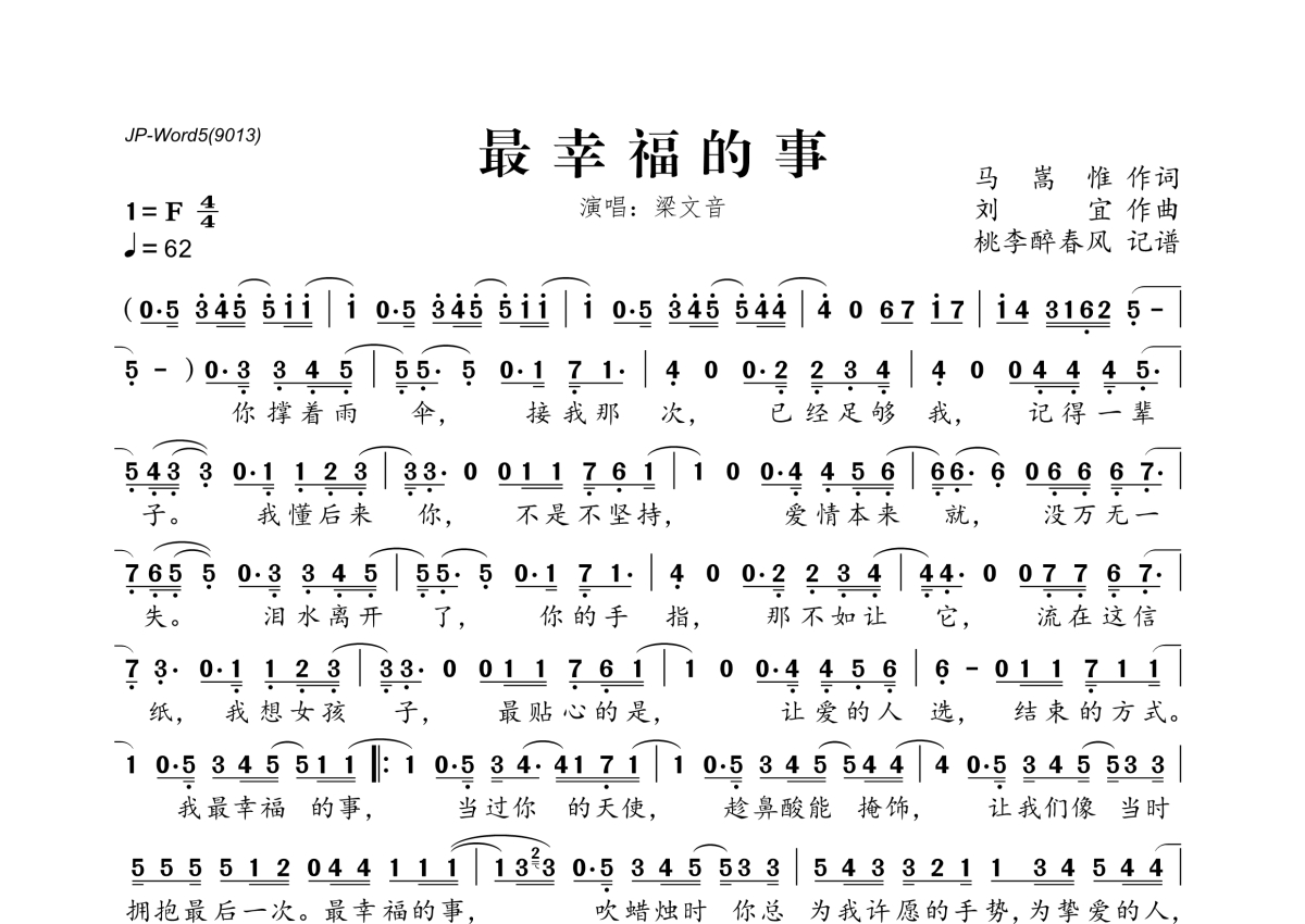 《最幸福的事》是梁文音演唱的一首歌曲,拍号为4/4拍,歌曲速度为每分钟62拍,这份简谱共有一张高清图谱,图谱由 @桃李醉春风 编配上传。