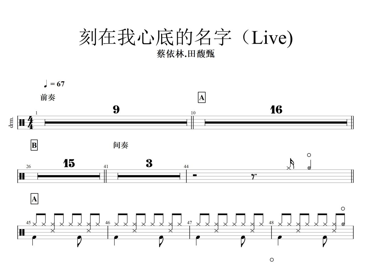 蔡依林/田馥甄《刻在我心底的名字》鼓谱 - 架子鼓谱