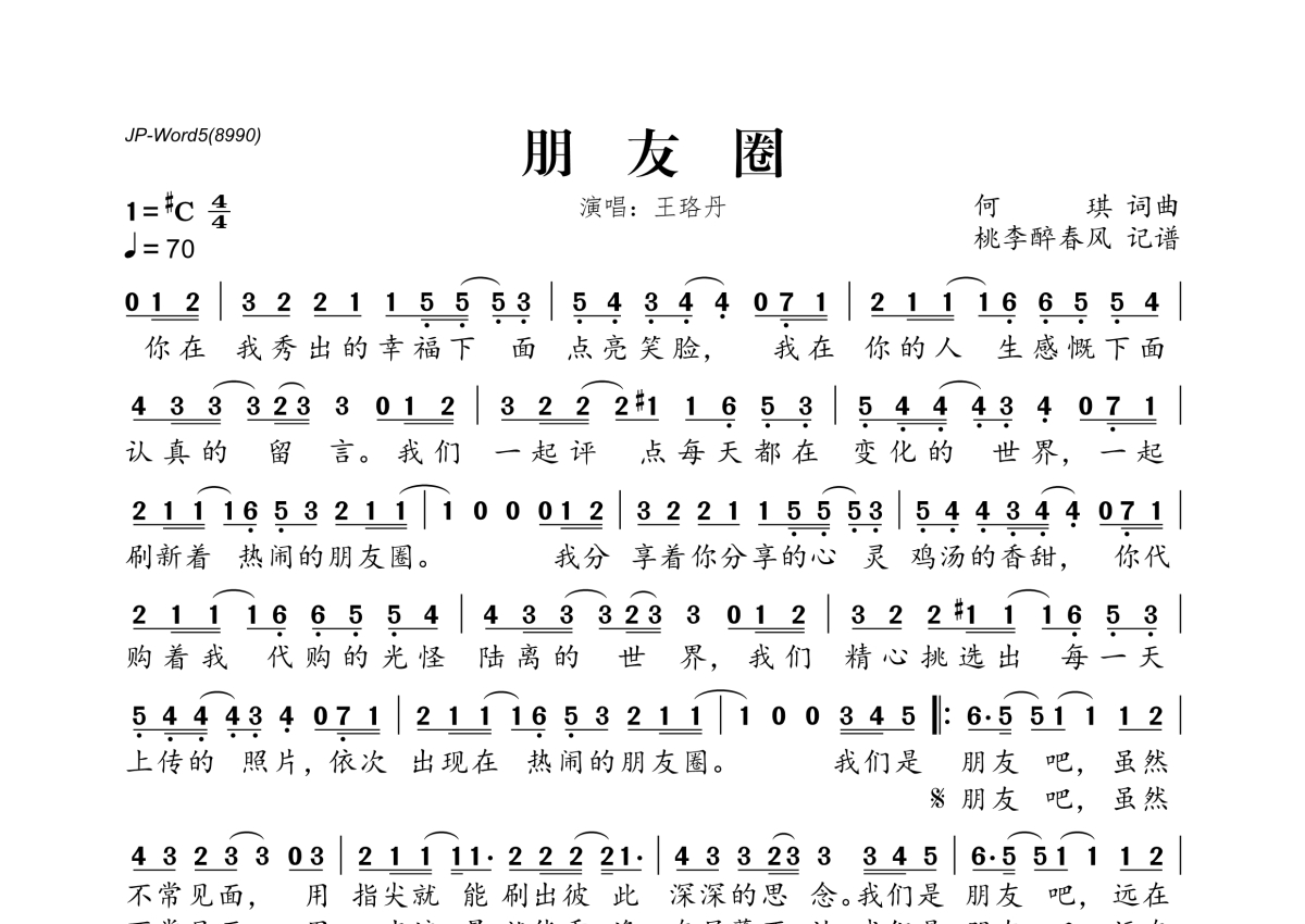 《朋友圈》是王珞丹演唱的一首歌曲,拍号为4/4拍,歌曲速度为每分钟70拍,这份简谱共有一张高清图谱,图谱由 @桃李醉春风 编配上传。