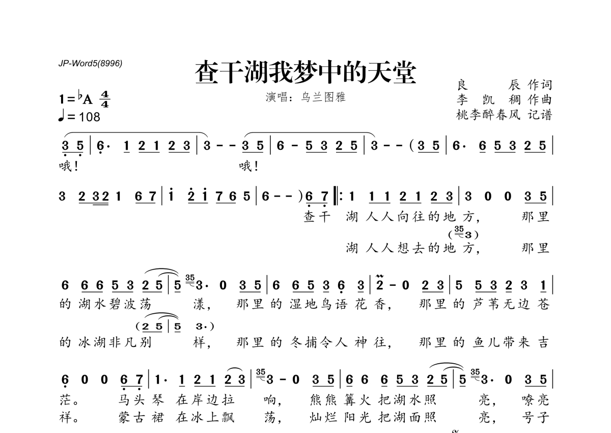 《查干湖我梦中的天堂》是鸟兰图雅演唱的一首歌曲,拍号为4/4拍,歌曲速度为每分钟108拍,这份简谱共有一张高清图谱,图谱由 @桃李醉春风 编配上传。