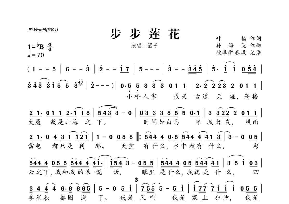 《步步莲花》是涵子演唱的一首歌曲,拍号为4/4拍,歌曲速度为每分钟70拍,这份简谱共有一张高清图谱,图谱由 @桃李醉春风 编配上传。