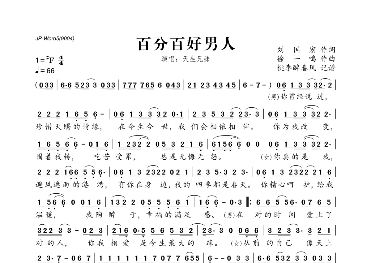 《百分百好男人》是天生兄妹演唱的一首歌曲,拍号为4/4拍,歌曲速度为每分钟66拍,这份简谱共有一张高清图谱,图谱由 @桃李醉春风 编配上传。