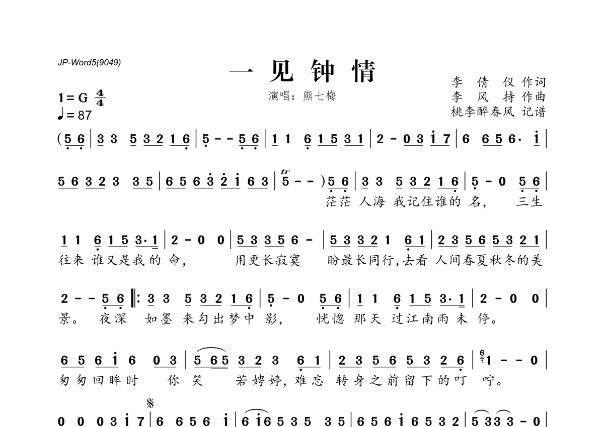 一见钟情简谱 - 熊七梅演唱