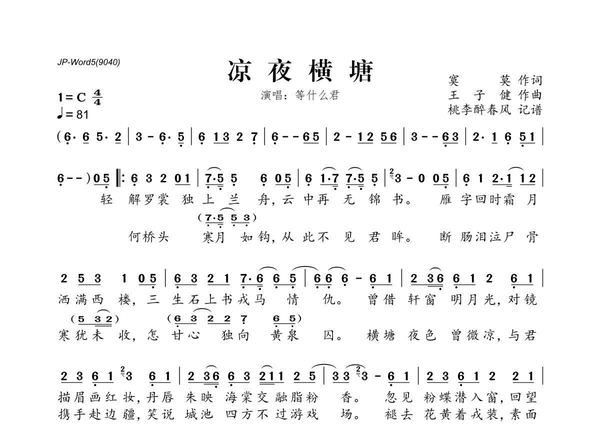 《凉夜横塘》是等什么君演唱的一首歌曲,拍号为4/4拍,歌曲速度为每分钟81拍,这份简谱共有一张高清图谱,图谱由 @桃李醉春风 编配上传。