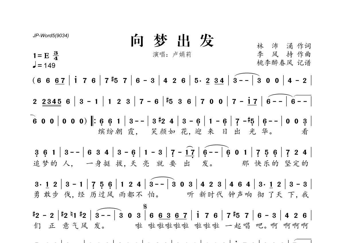 《向梦出发》是卢娟莉演唱的一首歌曲,拍号为3/4拍,歌曲速度为每分钟149拍,这份简谱共有一张高清图谱,图谱由 @桃李醉春风 编配上传。