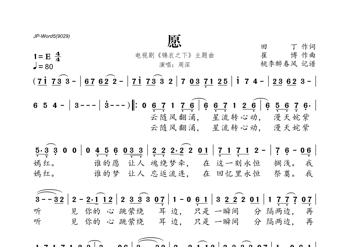 《愿》是周深演唱的一首歌曲,拍号为4/4拍,歌曲速度为每分钟80拍,这份简谱共有一张高清图谱,图谱由 @桃李醉春风 编配上传。