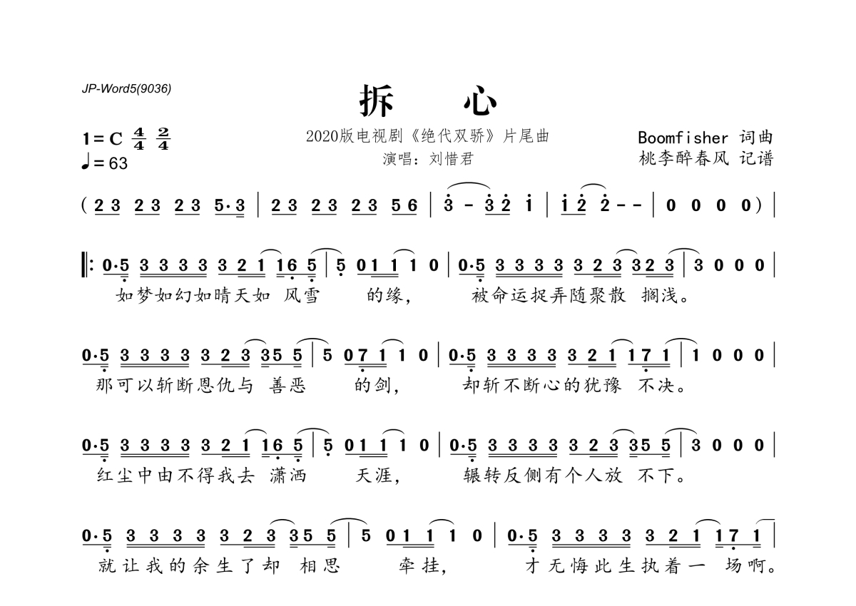 《拆心》是刘惜君演唱的一首歌曲,拍号为4/4拍,歌曲速度为每分钟63拍,这份简谱共有一张高清图谱,图谱由 @桃李醉春风 编配上传。